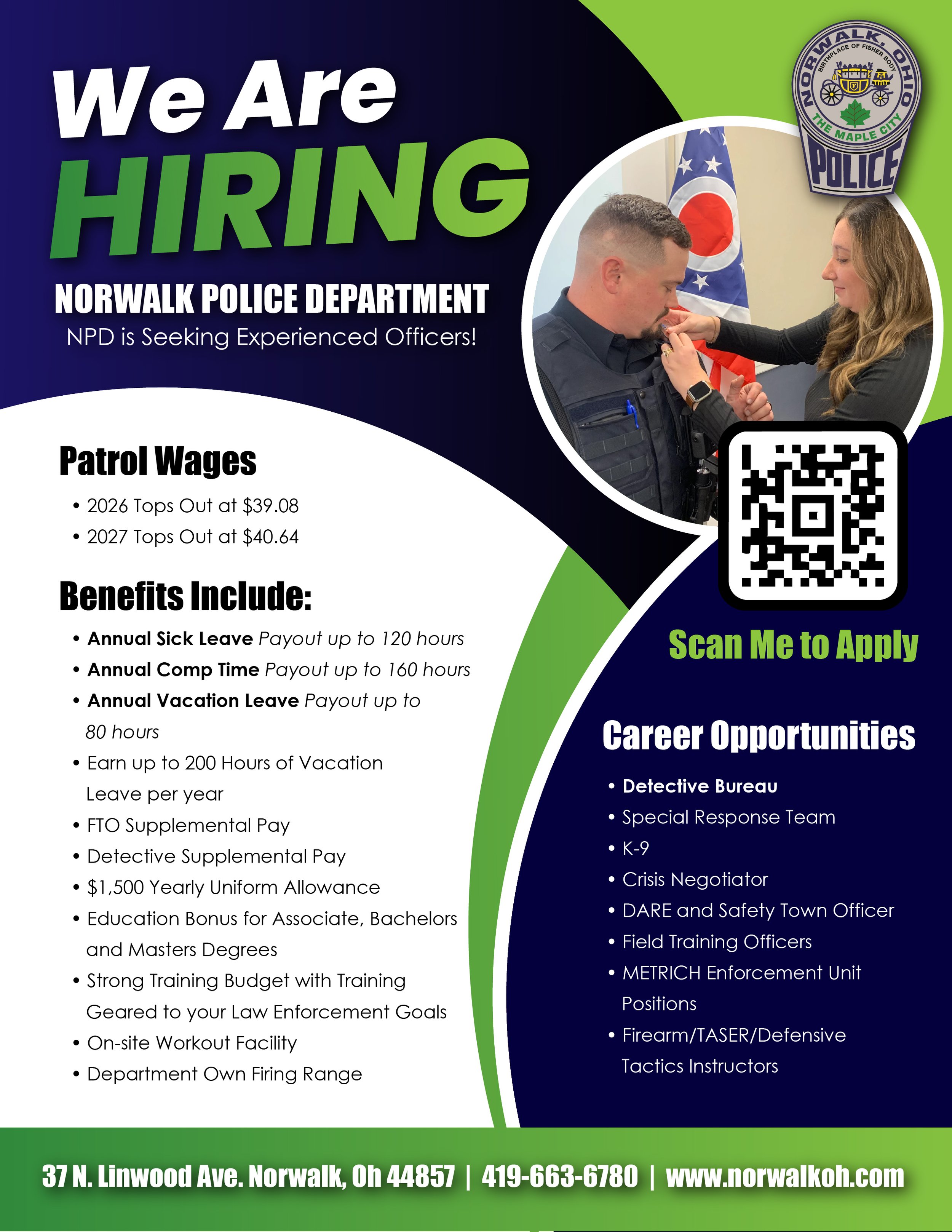 Call the Civil Service Commission Clerk Lisa to obtain further information on lateral transfers: 419-663-6700 ext. 1 or contact by email: cityofnorwalk@norwalkoh.com
